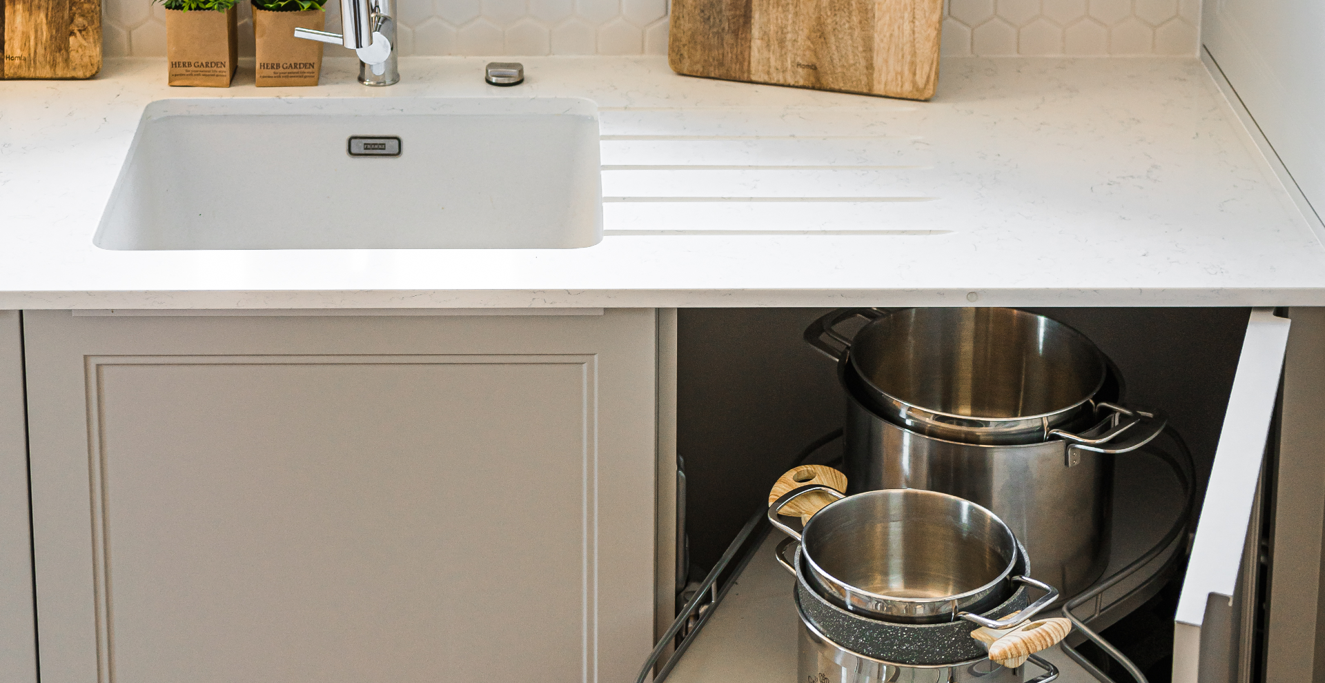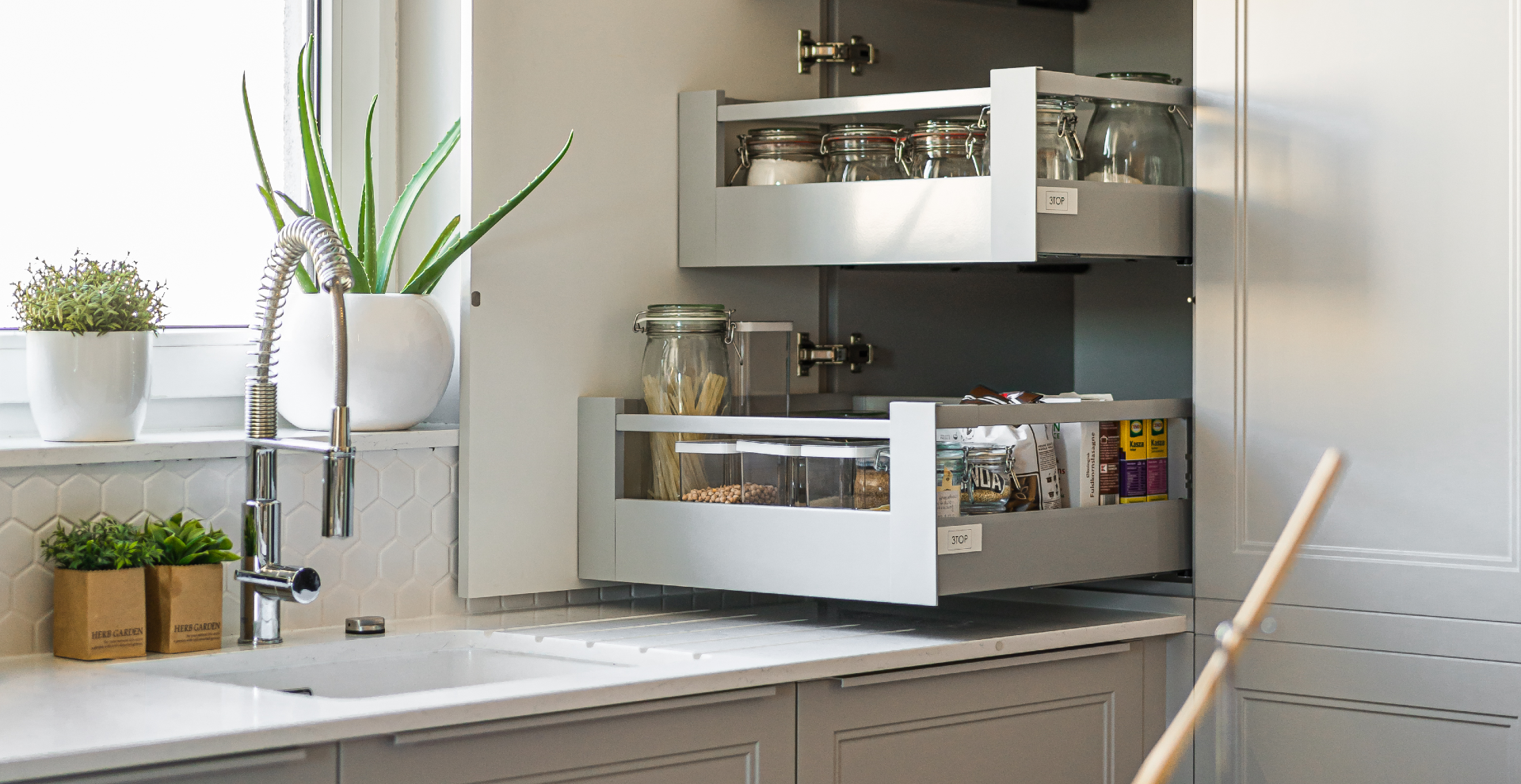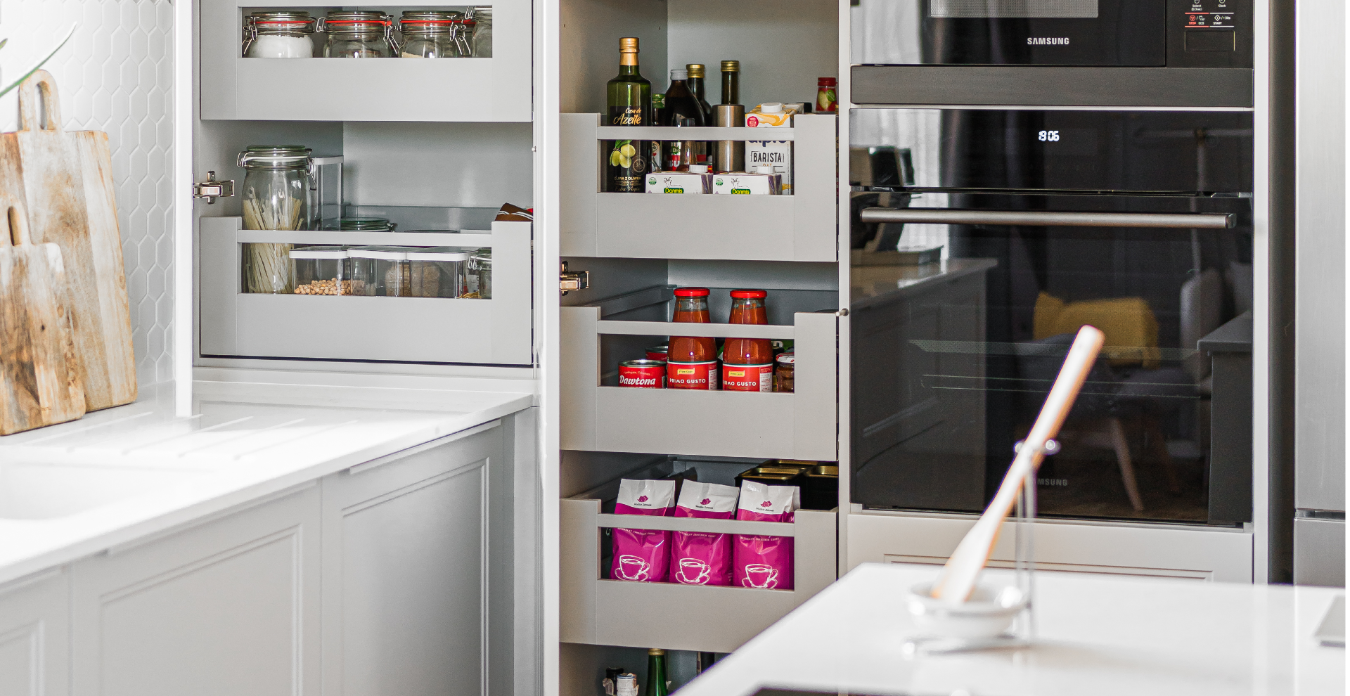 Dzięki zastosowaniu stylizowanych frontów w jasnych, delikatnych kolorach (biel i odcienie szarości) wpisujących się w styl Hamptons, wysokiej jakości blatu z konglomeratu oraz dużej ilości szuflad i systemów udało nam się sprostać oczekiwaniom naszych klientów – kuchnia doskonale odnajduje się w założonej stylistyce, jest wygodna dla użytkowników, a sprzęty zostały rozmieszczone w najbardziej ergonomiczny sposób i tworzą tak zwany trójkąt roboczy.