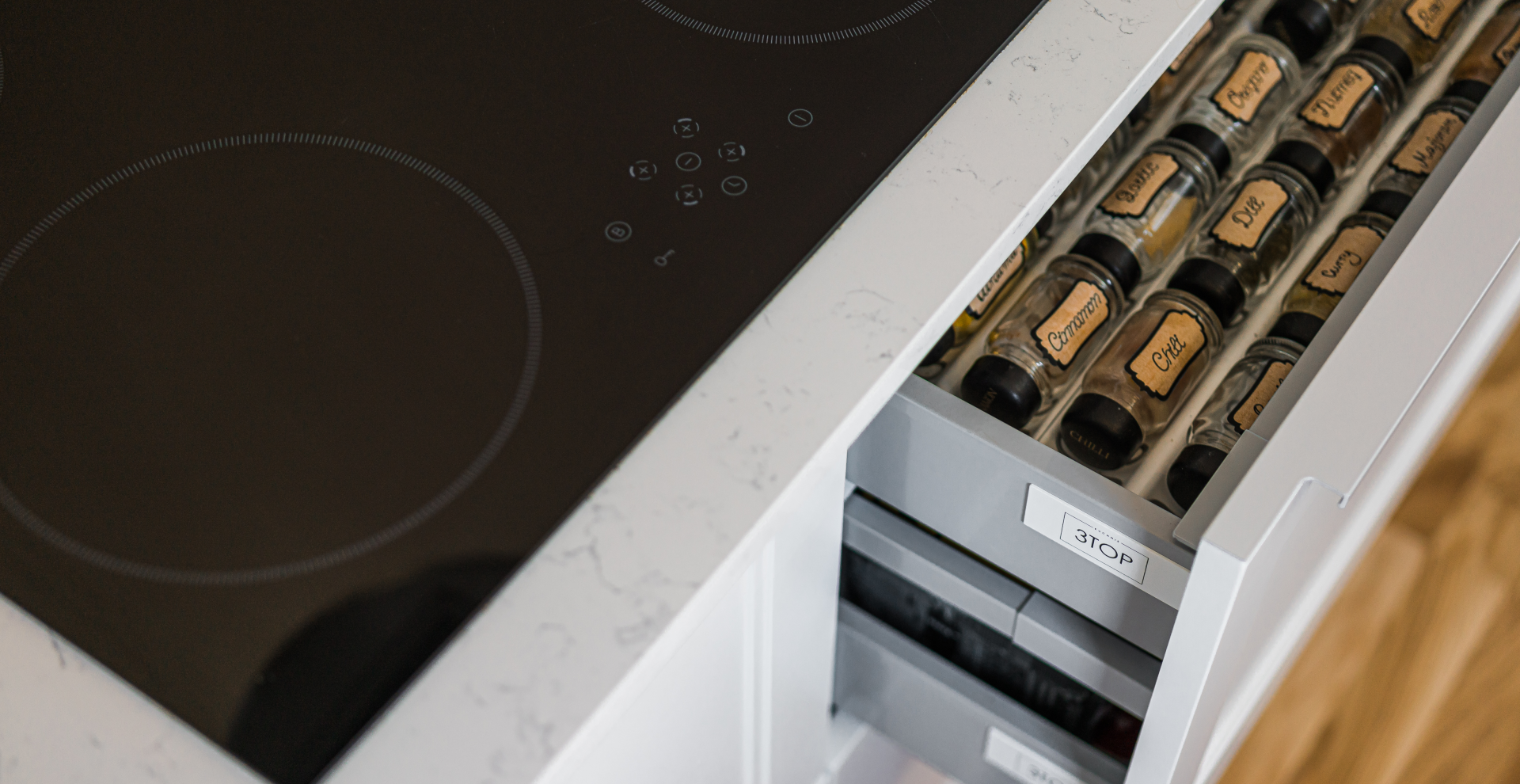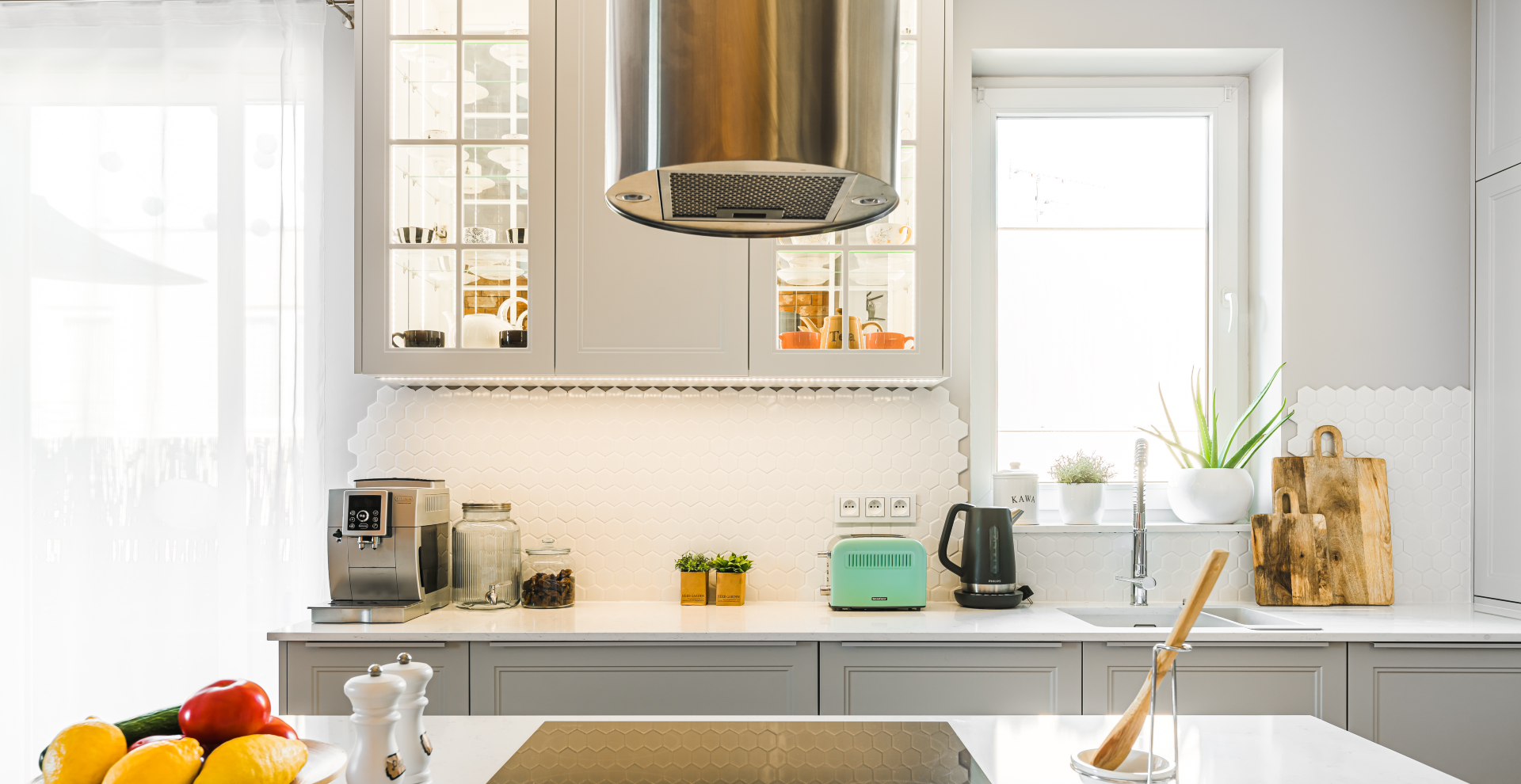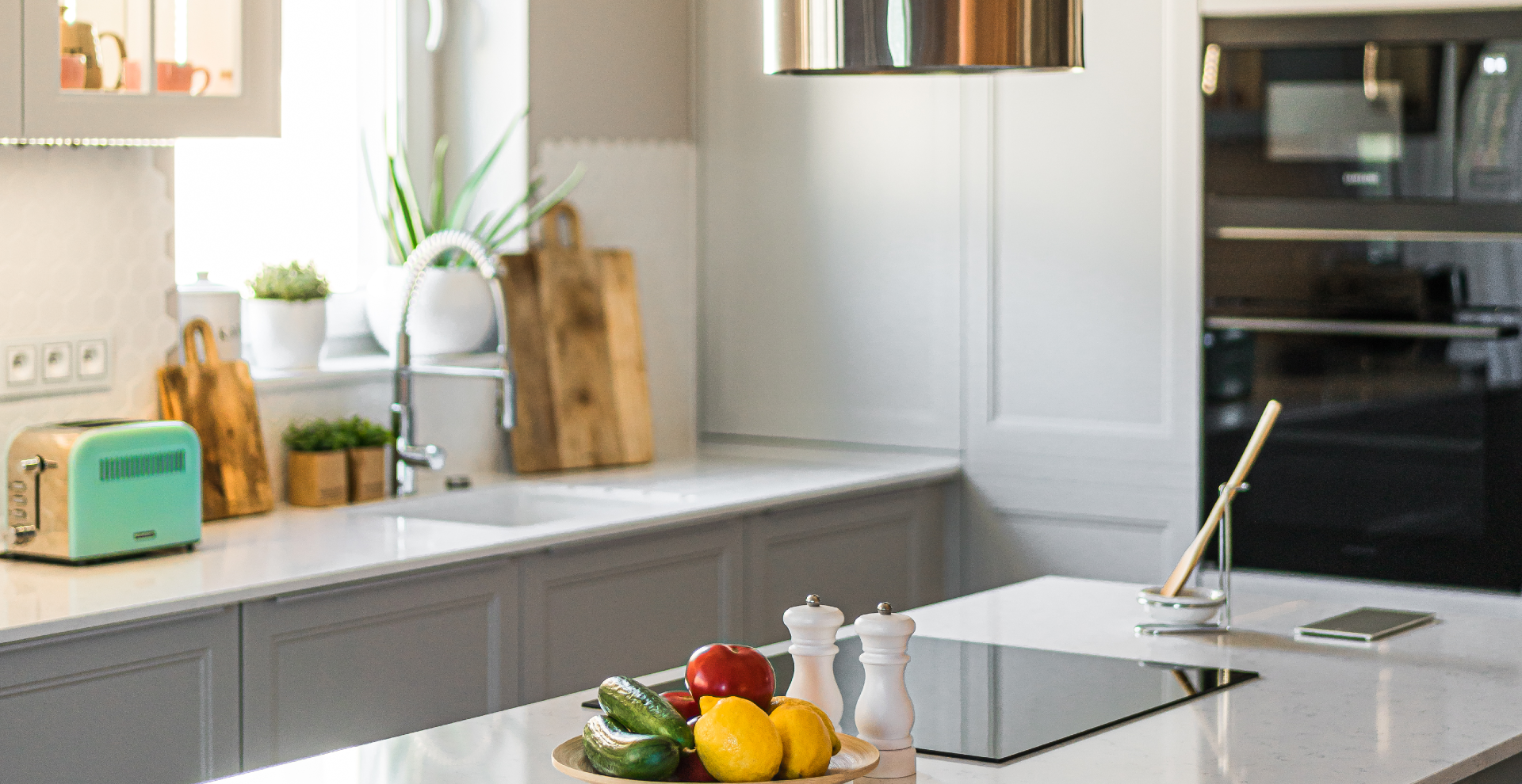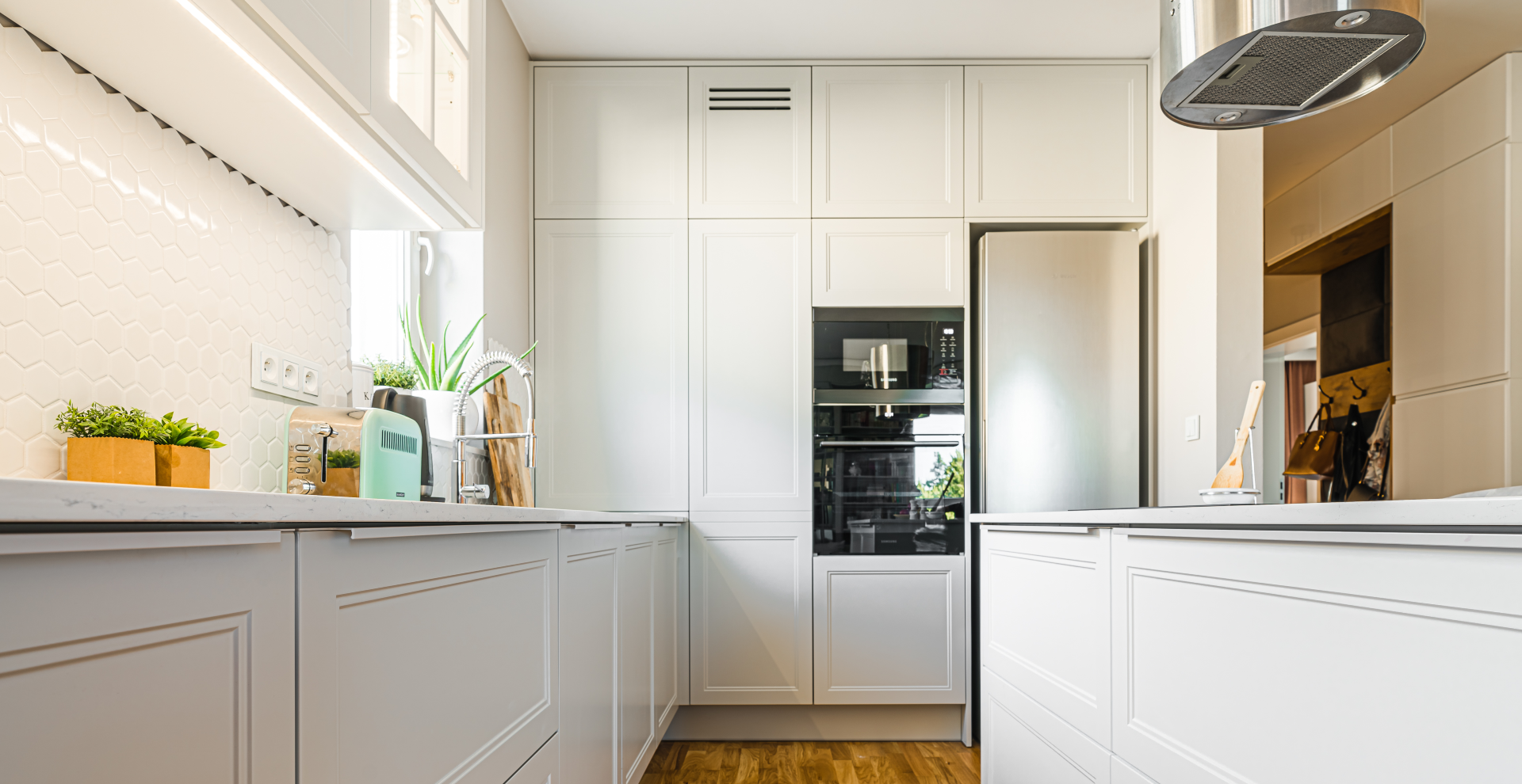 Dzięki zastosowaniu stylizowanych frontów w jasnych, delikatnych kolorach (biel i odcienie szarości) wpisujących się w styl Hamptons, wysokiej jakości blatu z konglomeratu oraz dużej ilości szuflad i systemów udało nam się sprostać oczekiwaniom naszych klientów – kuchnia doskonale odnajduje się w założonej stylistyce, jest wygodna dla użytkowników, a sprzęty zostały rozmieszczone w najbardziej ergonomiczny sposób i tworzą tak zwany trójkąt roboczy.