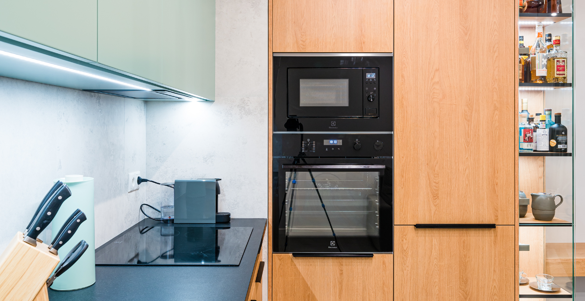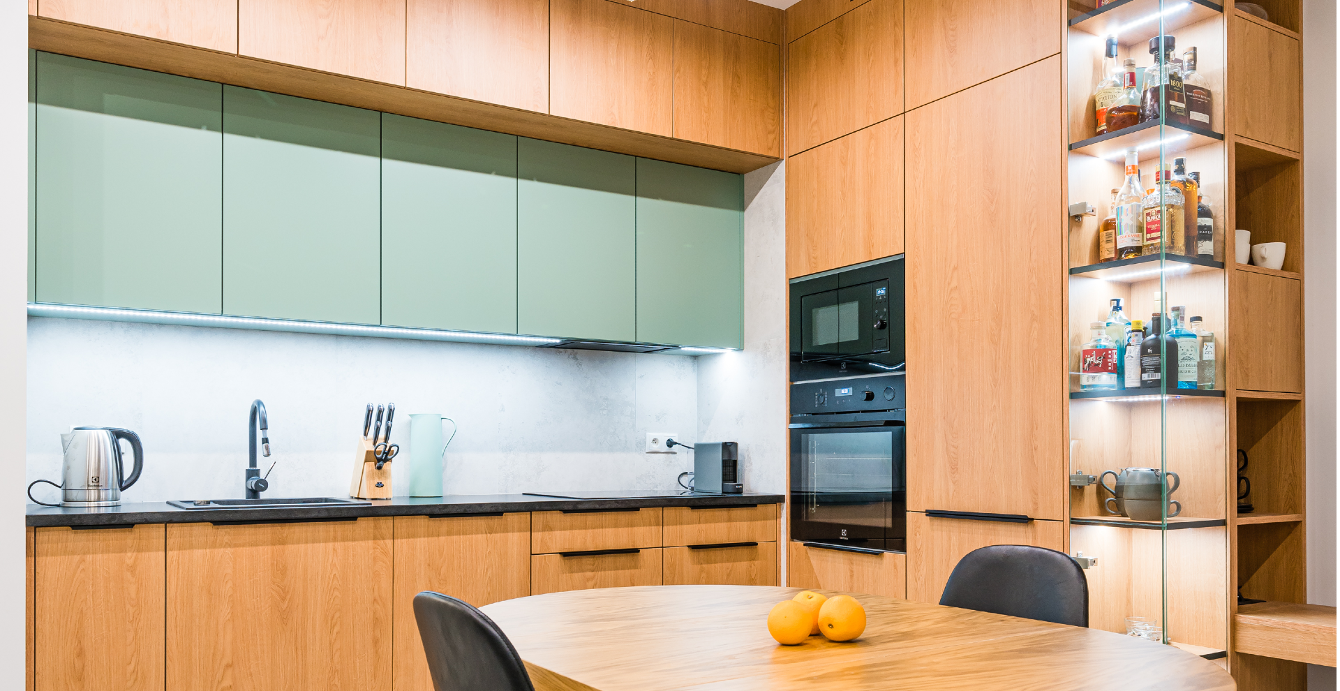 Naszym klientom do gustu przypadły wysokiej klasy materiały takie jak fornir dębowy czy granit. Wybór blatu był jedynym z możliwych, dlatego kiedy przyszła decyzja o cięciu kosztów padło na fronty. Zaproponowaliśmy klientom płytę laminowaną z kolekcji firmy Egger, która do złudzenia przypomina naturalny fornir. Dzięki takiej zmianie koszt kuchni zmniejszył się bez żadnych strat wizualnych.