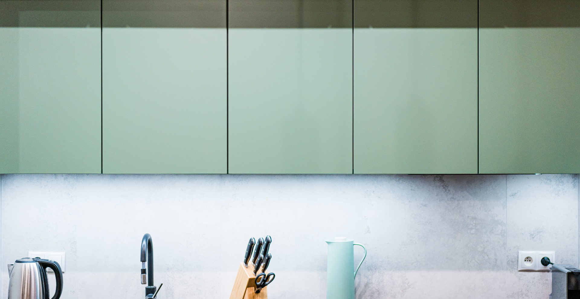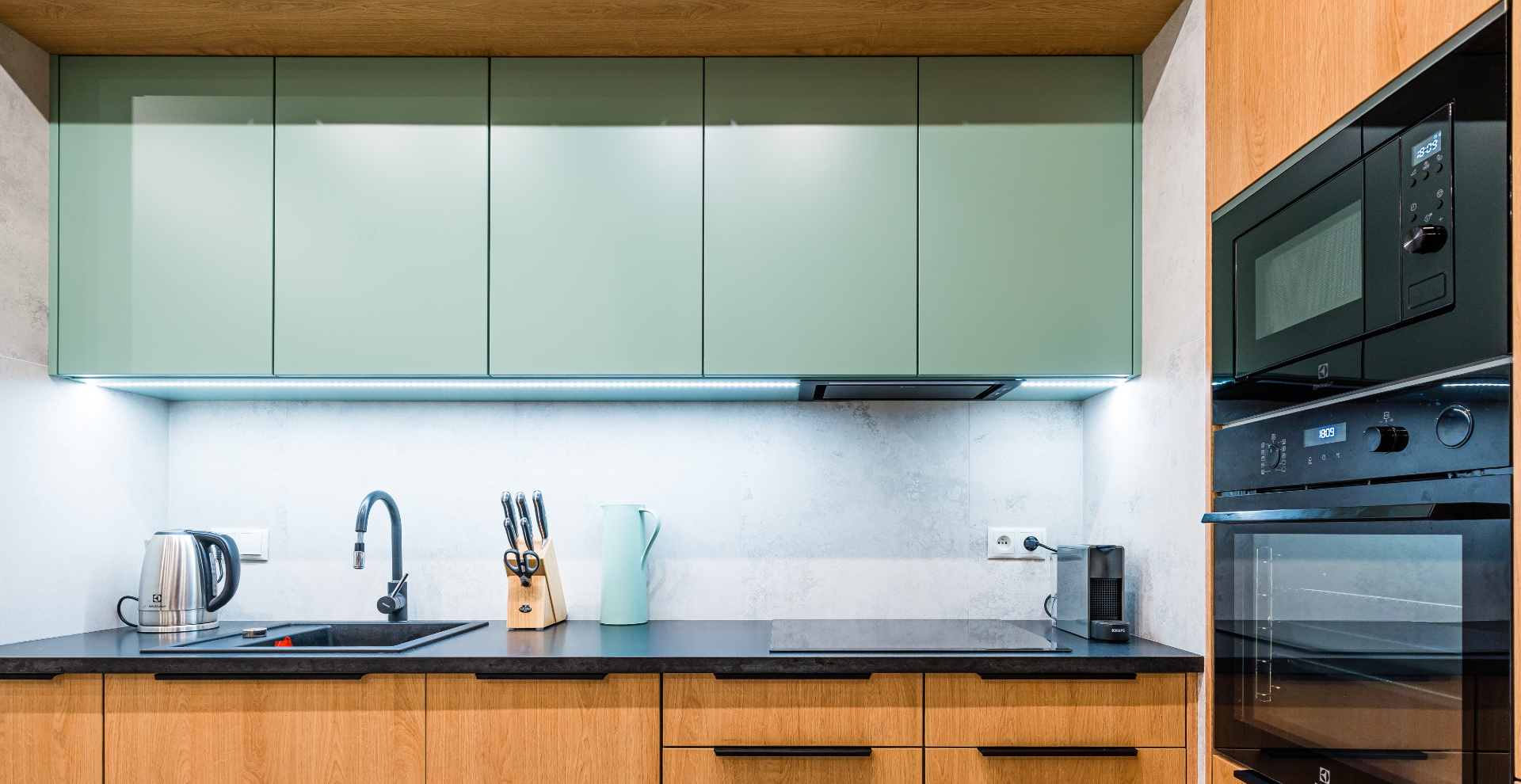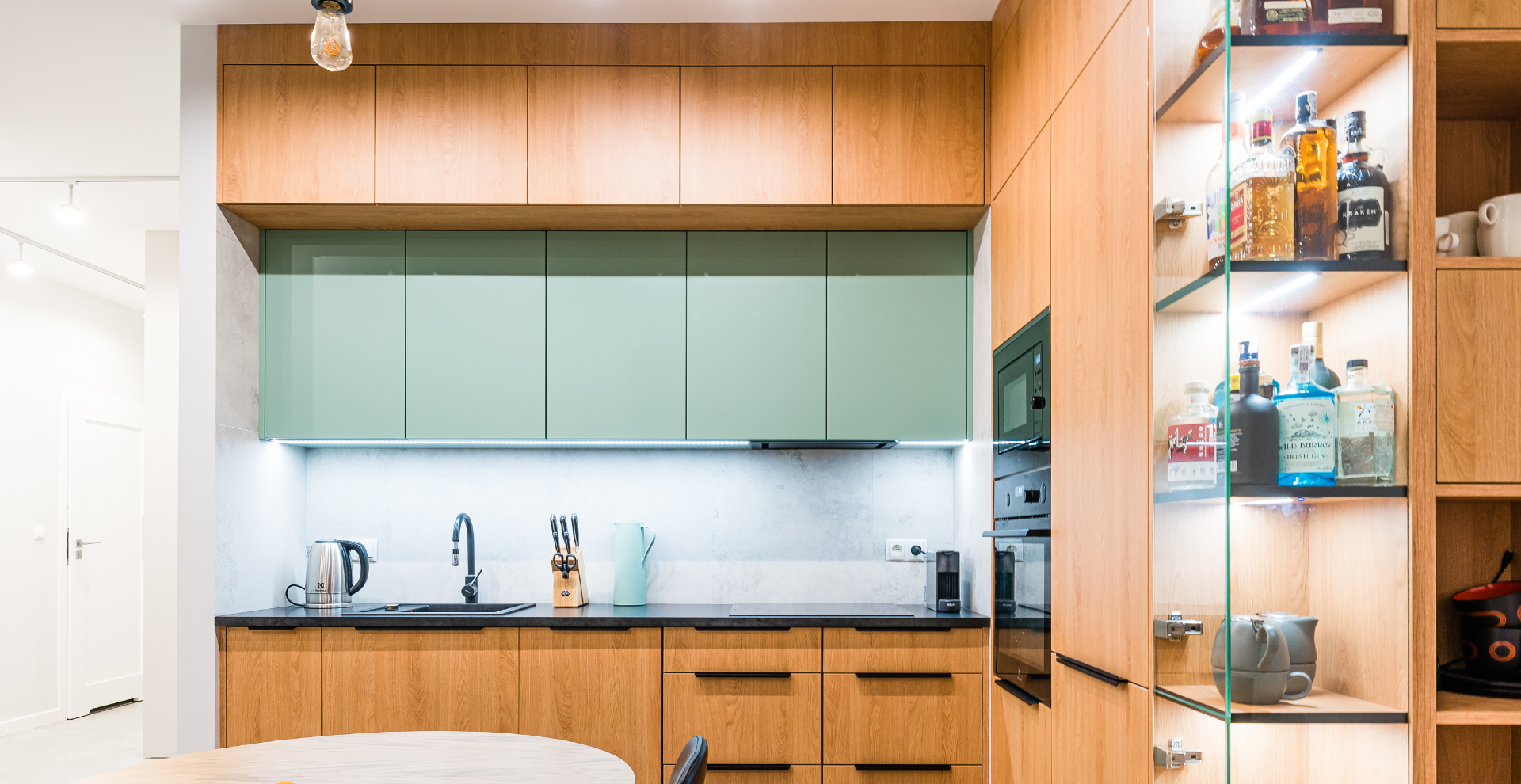 Decyzja padła na szałwiową zieleń, która została zastosowana na frontach szafek wiszących.